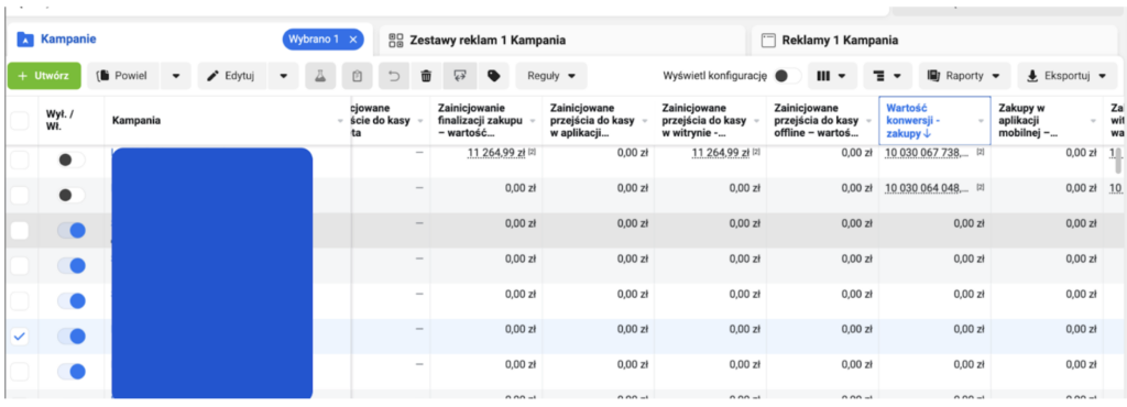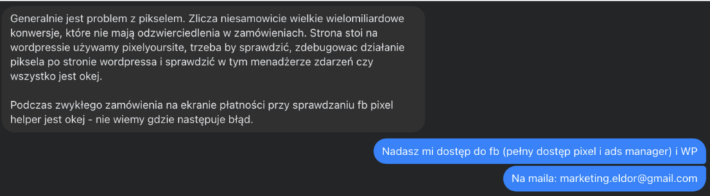 Przystąpiłem do pracy, zebrałem dostępu do strony internetowej i panelu meta. Z racji tego, że sklep raportował MILIARDY złotych z zamówień utworzyliśmy również kody promocyjne, żebym mógł przejść swobodnie bramki płatności. Zweryfikowałem problem - faktycznie coś jest nie tak, spójrz proszę na wartości konwersji zakupy.