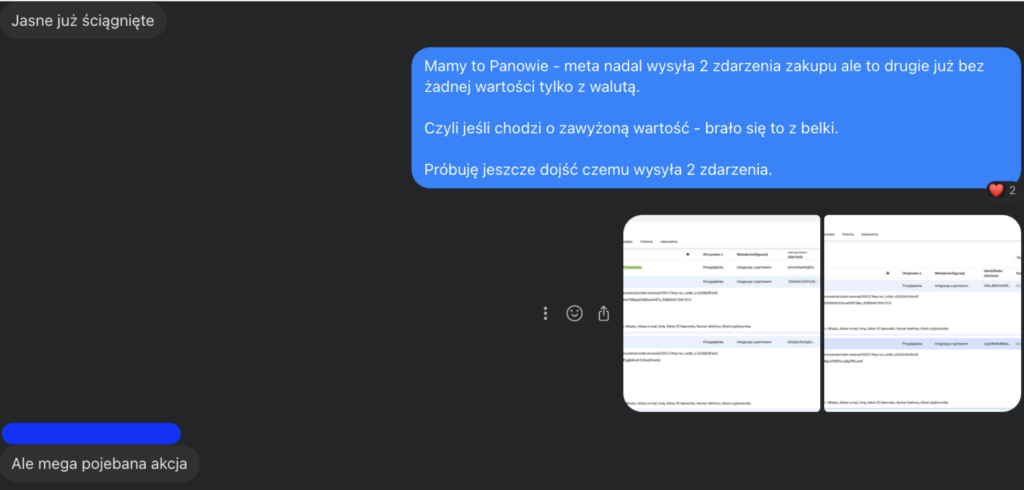 Zainteresowałem się mocniej i zacząłem kopać. Zauważyłem, że po dokonaniu zakupu, co któryś raz (nie regularnie) strona zamiast wysłać jedno zdarzenie zakupu wysyła 2.